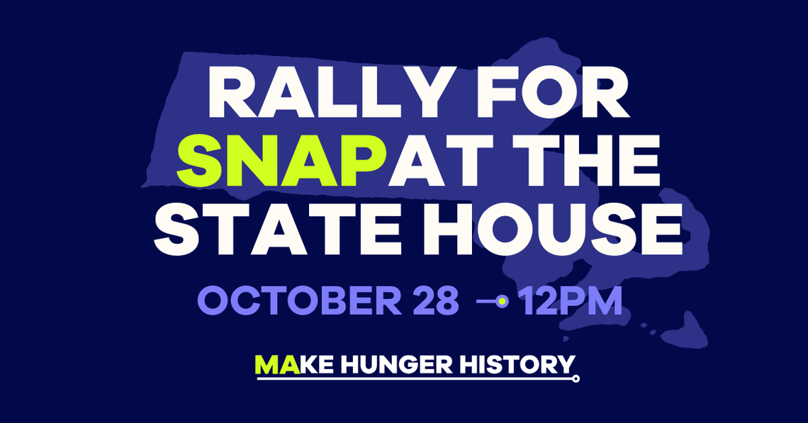The Make Hunger History Coalition has organized an emergency rally at the State House on Tuesday, October 28, from 12-1 PM. They are calling on the Trump Administration to use USDA emergency funds to cover the cost of the SNAP program through the end of the government shutdown. If the federal government refuses to act, then rally organizers call upon state leaders to draw upon the estimated $8 billion Rainy Day Fund to fund SNAP through the shutdown.